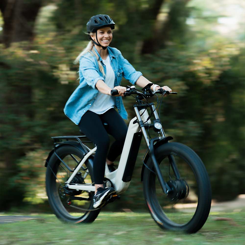 Our electric bikes can reach speeds of up to 50 km/h and have an average range of 100 km with pedal assist. Keep in mind, range can vary based on terrain, rider weight, and motor use.